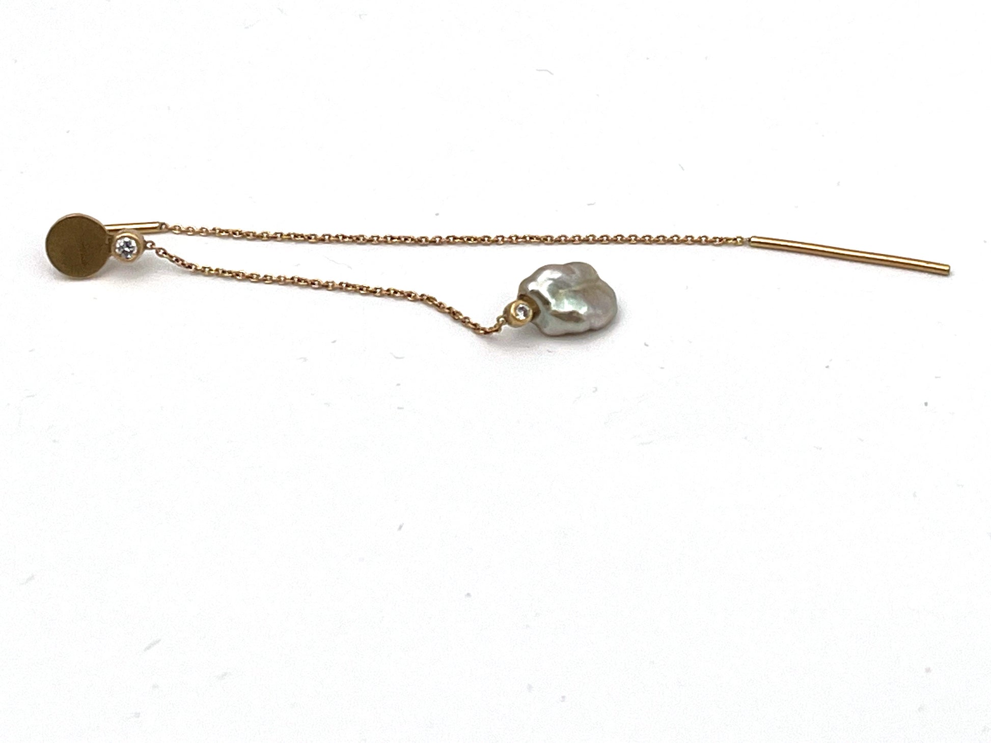 Material: 18k gold w. 1*0.05 & 1*0.02 ct tw vvs diamonds & a Keshi pearl