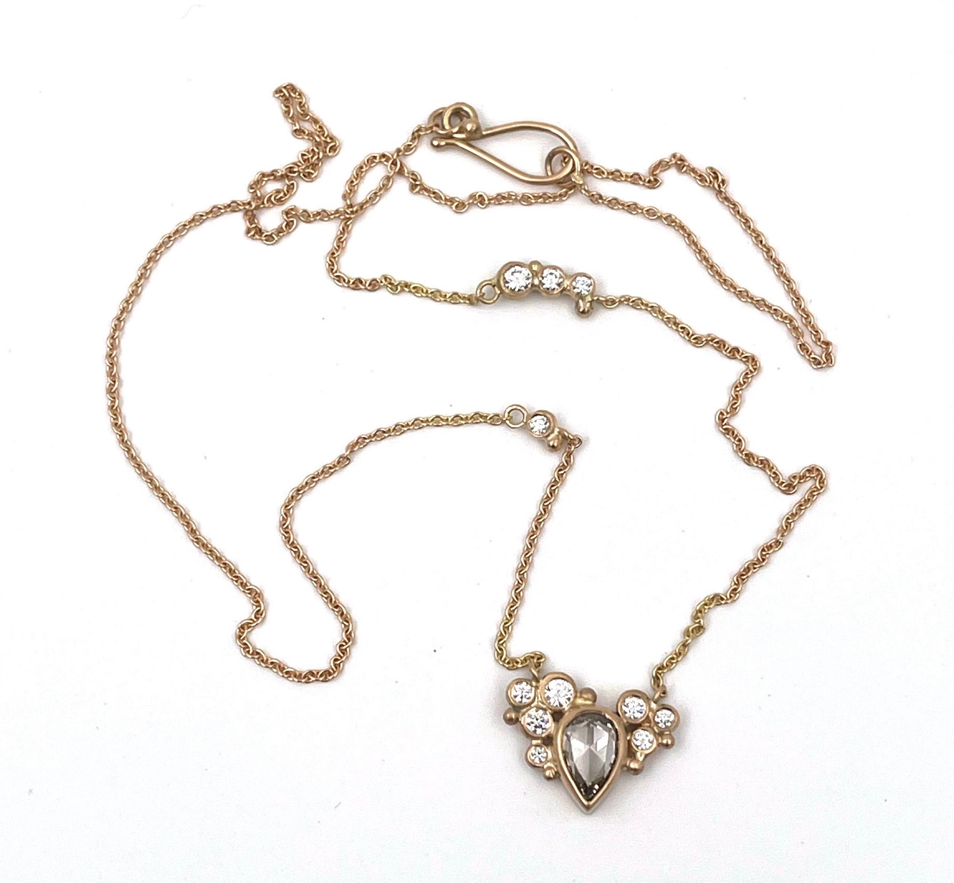 Materiale: 18 k guld med 1 × 0,79 ct. rosetslebet dråbeformet diamant, 2 × 0,05 ct., 3 × 0,03 ct., 3 × 0,02 ct., 2 × 0,015 ct. og 1 × 0,01 ct. TW/vvs brillanter