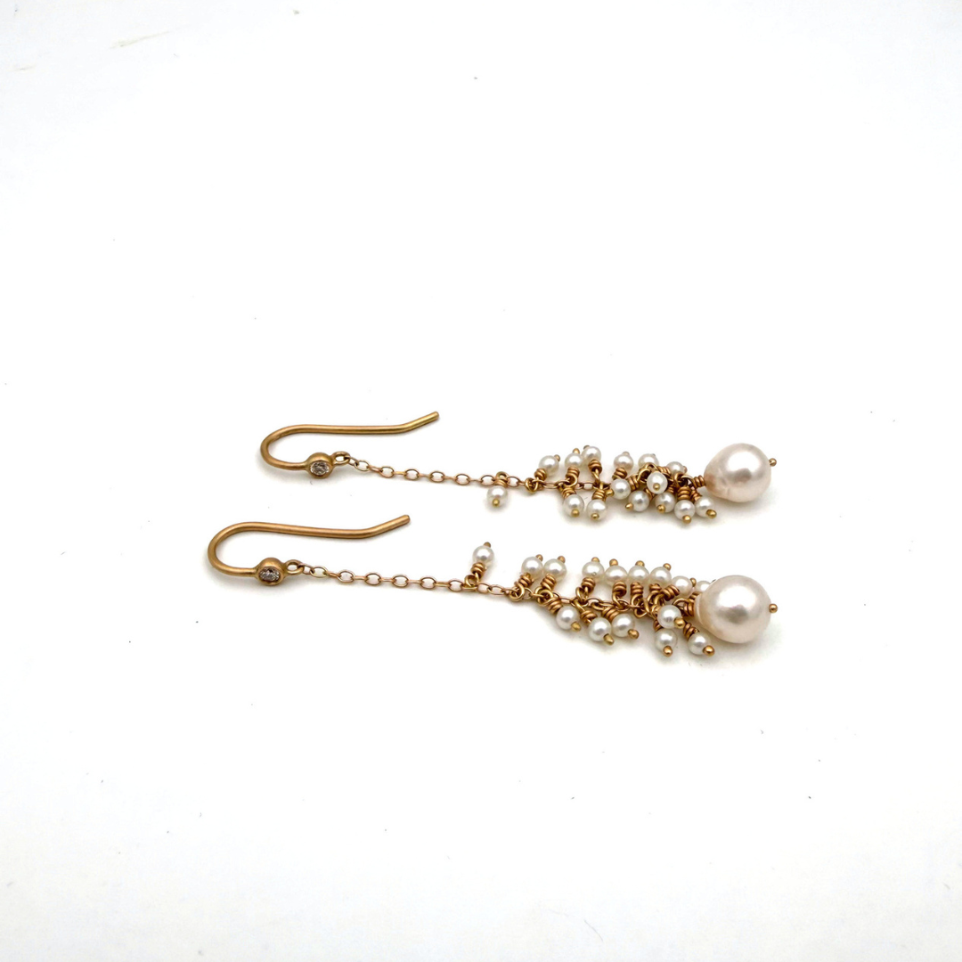 Materiale: 18 k guld med 2×0,05 ct. TW/vvs brillanter, 2 salt 'n pepper diamanter og små ferskvandsperler