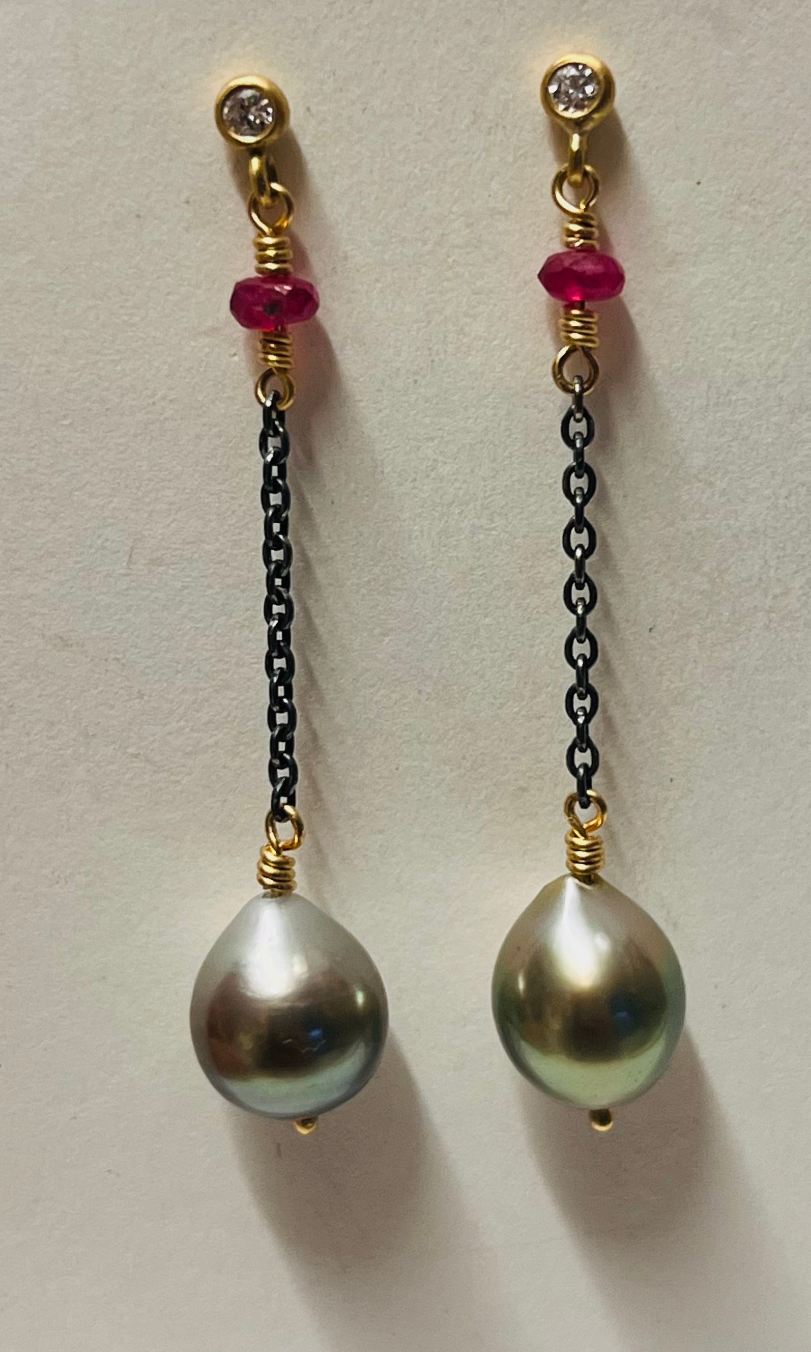 Materiale: 18 k guld og sølv med 2×0,03 ct. TW/vvs brillanter, rubiner og tahiti-perler