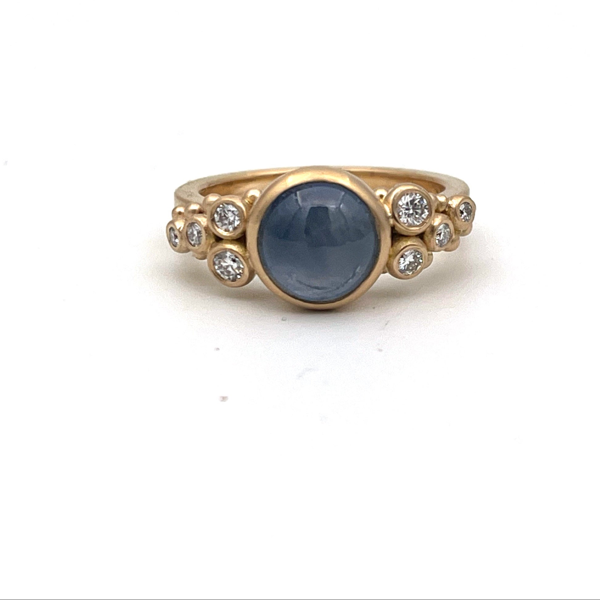 Materiale: 18 k guld med stjernesafir (ubehandlet, Burma) samt 2 × 0,05 ct., 1 × 0,03 ct., 1 × 0,02 ct. og 1 × 0,015 ct. TW/vvs brillanter