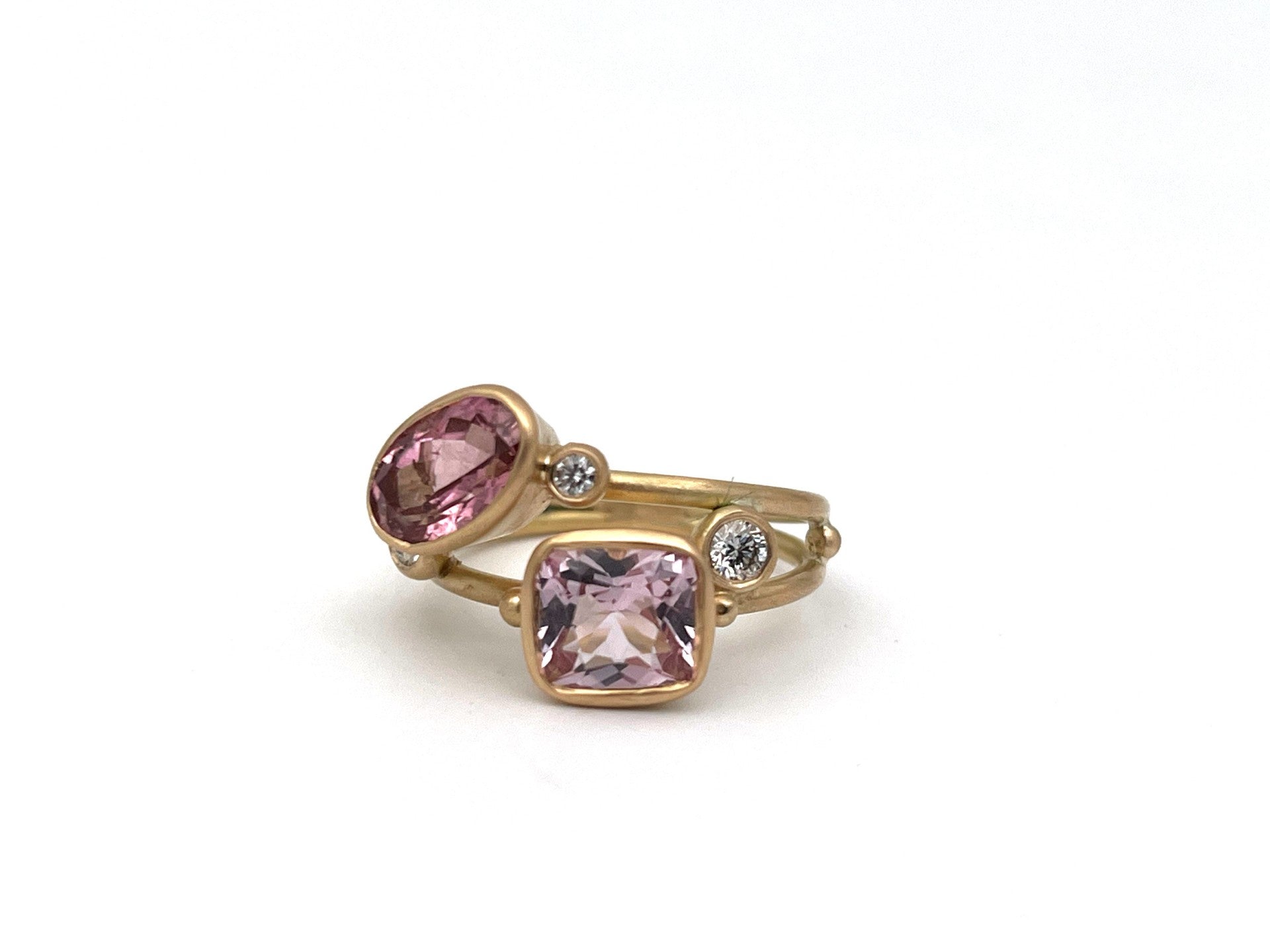 Materiale: 18 kt. guld med lyserød turmalin/morganit, 1 × 0,10 ct., 1 × 0,07 ct. og 1 × 0,03 ct. brillanter