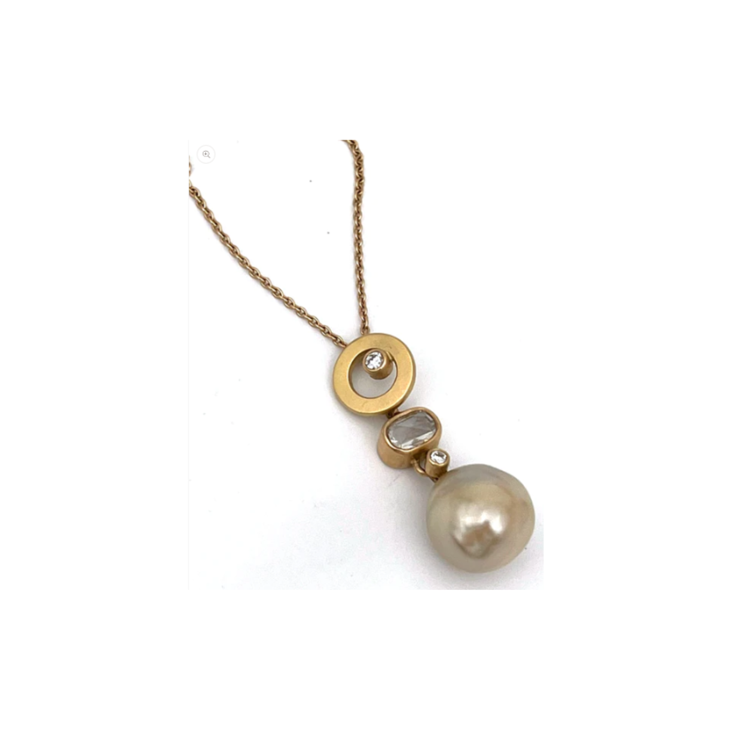 Materiale: 18 k guld halskæde med South Sea-perle, 0,37 ct. rosetslebet hvid diamant, 1 × 0,05 ct. og 1 × 0,03 ct. TW VVS brillantslebne diamanter