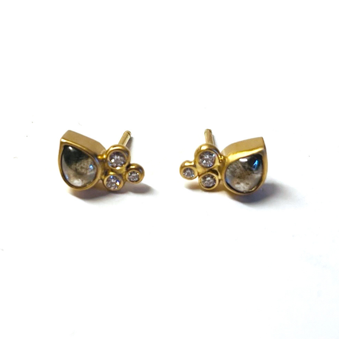 Materiale: 18k guld med 2 dråbeformede salt’n pepper diamanter (0,49 ct. / 0,42 ct.) samt 2×0,03 ct., 2×0,02 ct. og 2×0,01 ct. TW/vvs brillanter