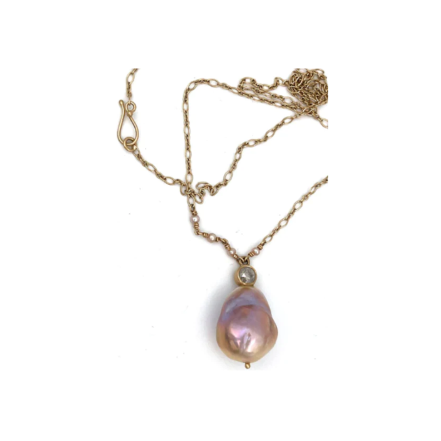 Materiale: 18k guld halskæde med lyserød ferskvandsperle og 0,47 ct. grå, rosetslebet diamant